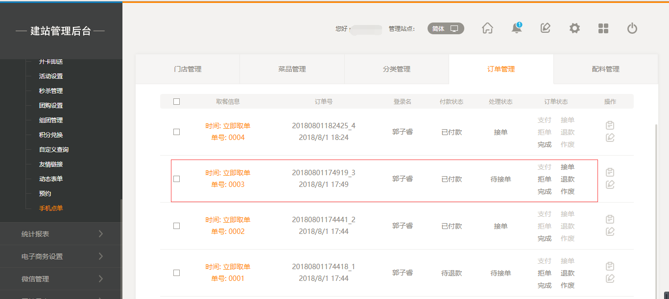 5.在“会员中心”中—“手机点单”中可以看到所有的订单详情,如图所示:
